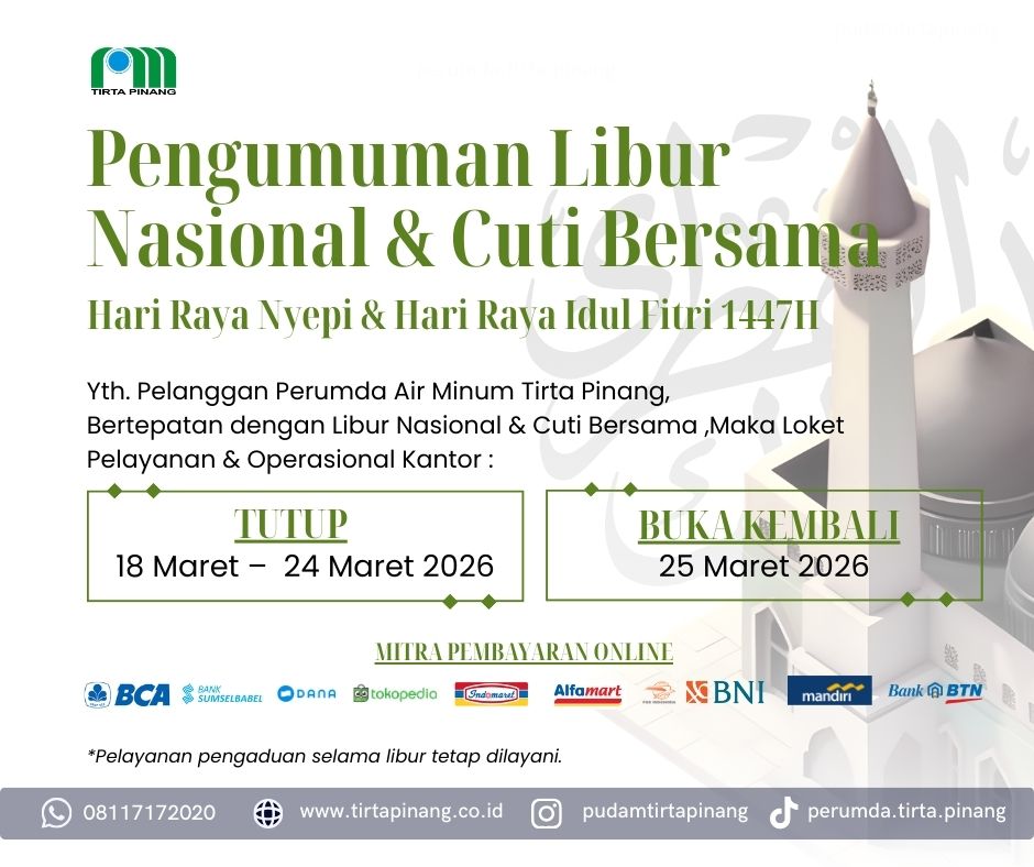 Pekerjaan Pemasangan Plat Duiker Pangkalpinang 22 November 2025, Perumda Air Minum Tirta Pinang menyampaikan kepada seluruh pelanggan bahwa akan terjadi gangguan distribusi air pada beberapa wilayah layanan khususnya pendistribusian air wilayah pelayanan Reservoir Bukit Intan. Gangguan ini disebabkan adanya pekerjaan pemasangan plat duiker Dinas PUPR Kota Pangkalpinang dan pemindahan jaringan pipa distribusi PDAM diameter 350…